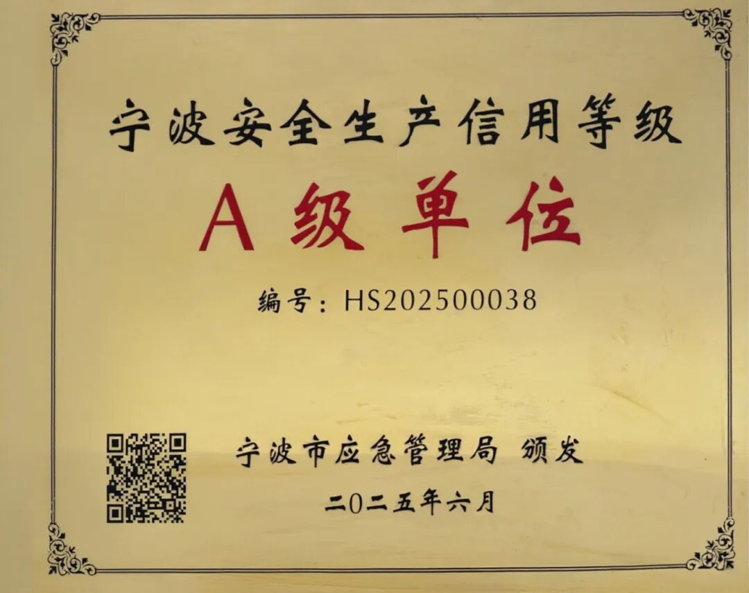 成功斩获“宁波市安全生产信用等级A级”荣誉,这是宁波市对市场主体安全生产综合能力的最高级别认可。